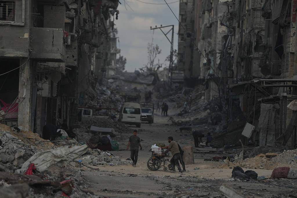 当地时间2025年10月12日,加沙城,以色列和哈马斯同意暂停战争并释放剩余人质后,巴勒斯坦人推着装载物品的手推车返回家园现货原油走势。视觉中国 图