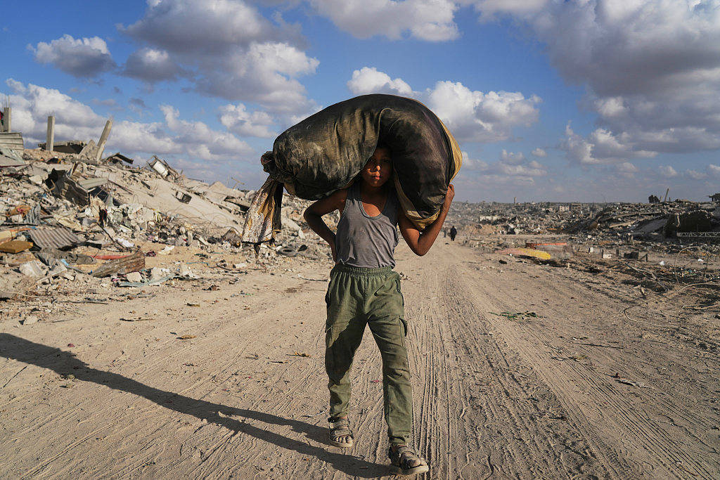 当地时间2025年10月12日,加沙城,以色列和哈马斯同意暂停冲突并释放剩余人质后,一名流离失所的巴勒斯坦男孩带着自己的物品走在满目疮痍的街道现货原油走势。视觉中国 图